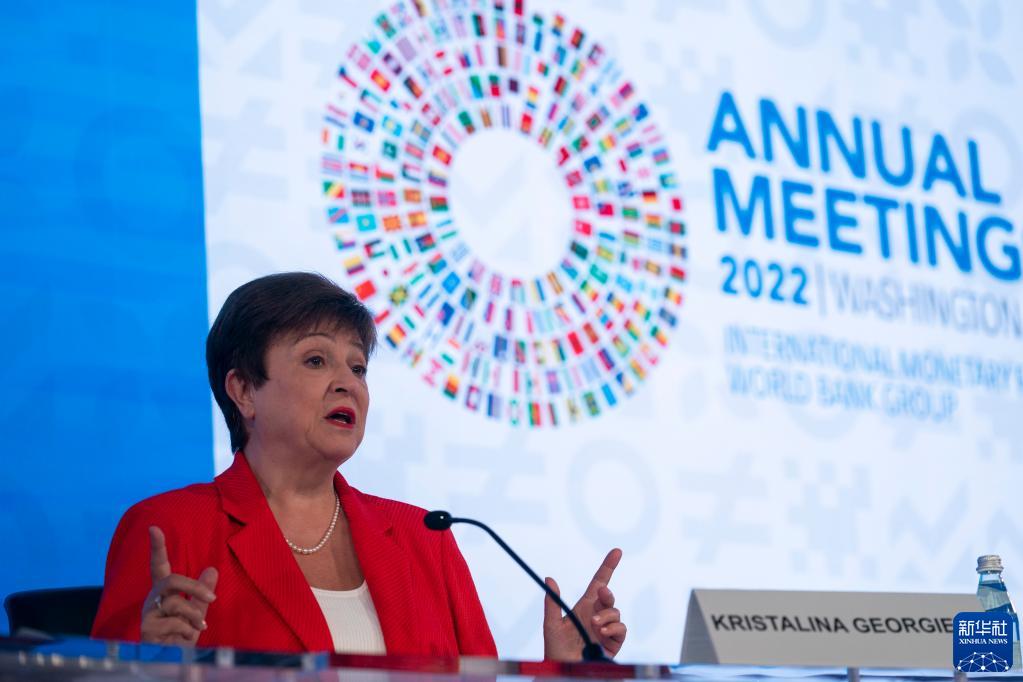 10月13日,在美國華盛頓,國際貨幣基金組織(IMF)總裁格奧爾基耶娃出席記者會。