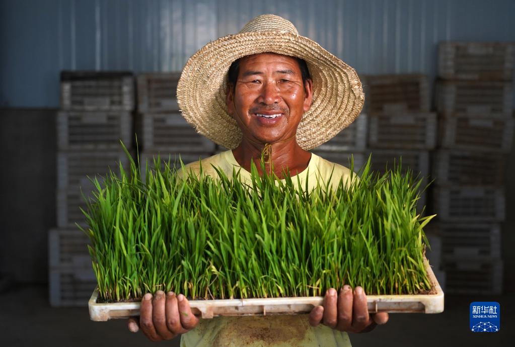 在江西省南昌縣大田農社,農民手捧秧盤展示秧苗(7月20日攝)。