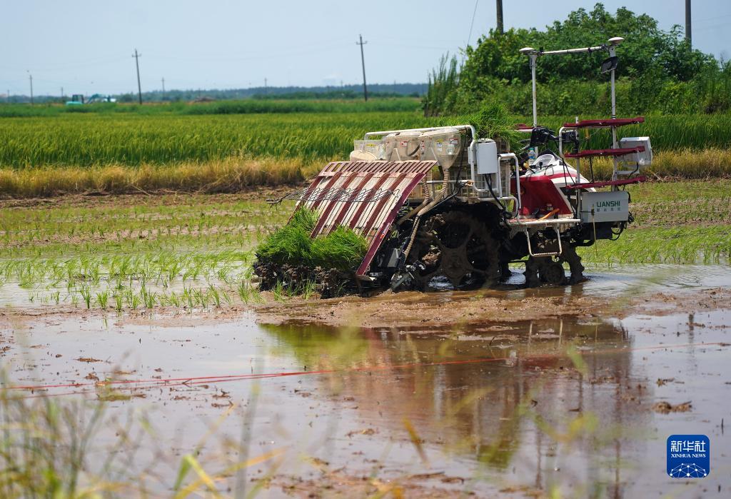在江西省南昌縣大田農(nóng)社,無人駕駛插秧機(jī)在水田里插秧(7月20日攝)。無人駕駛插秧機(jī)的運(yùn)用,減輕了農(nóng)民的勞動強(qiáng)度,大幅提高了插秧自動化水平和作業(yè)效率。