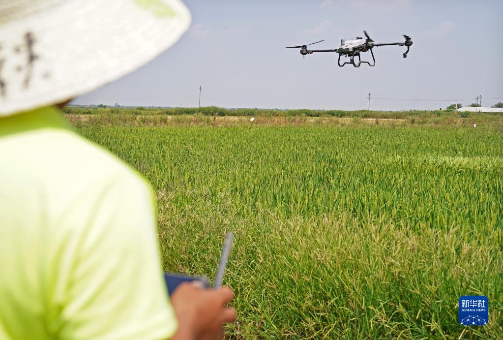 在江西省南昌縣大田農社,農民操控無人機為稻田施肥(9月16日攝)。