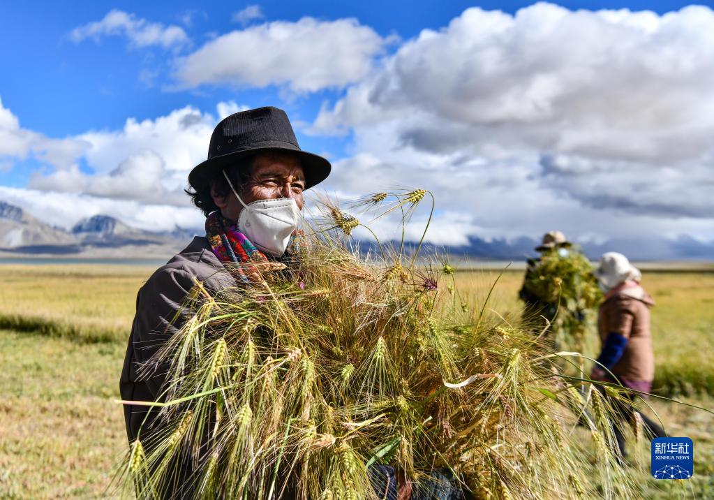 西藏日喀則市堆納鄉村民在收割青稞(2022年9月16日攝)。