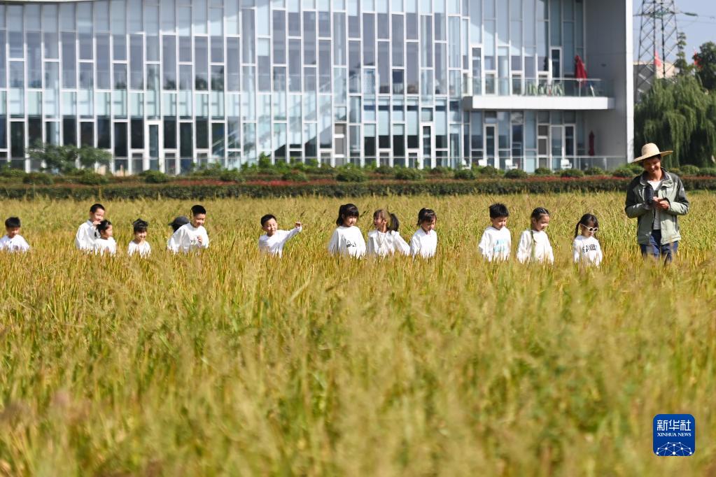 10月14日,浙江省湖州市吳興高新區(qū)靈糧農(nóng)場(chǎng)的農(nóng)技人員帶領(lǐng)小朋友參觀稻田,介紹種糧知識(shí)。