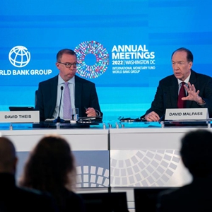 10月13日,在美國首都華盛頓,世界銀行行長馬爾帕斯(右)在記者會上發(fā)言。