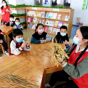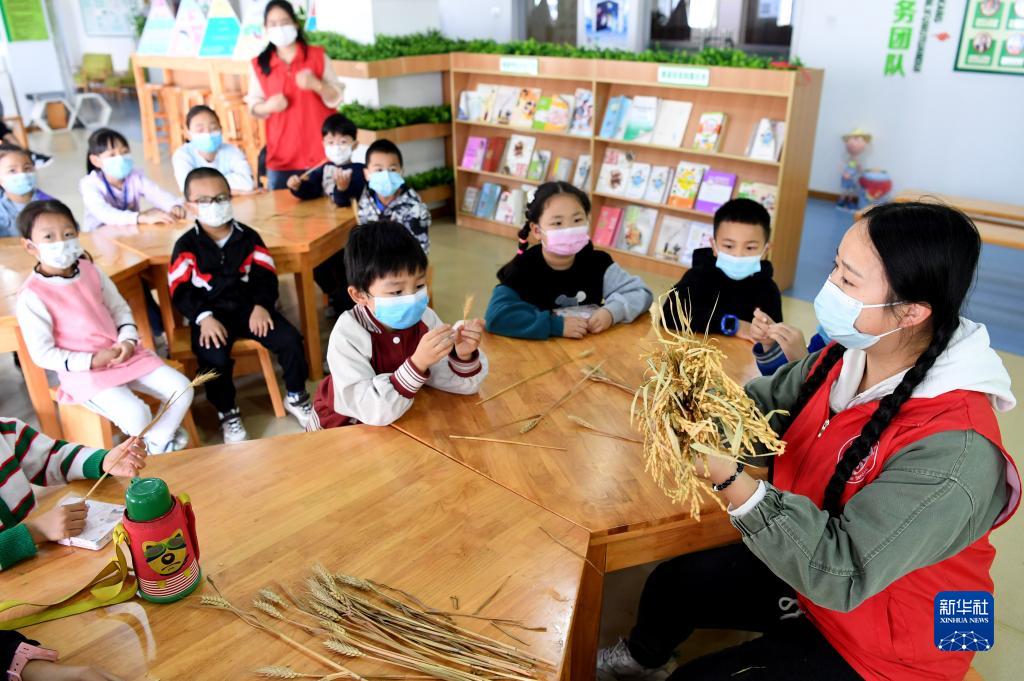 10月15日,安徽省合肥市包河區常青街道油坊崗社區志愿者向轄區小朋友介紹糧食作物。