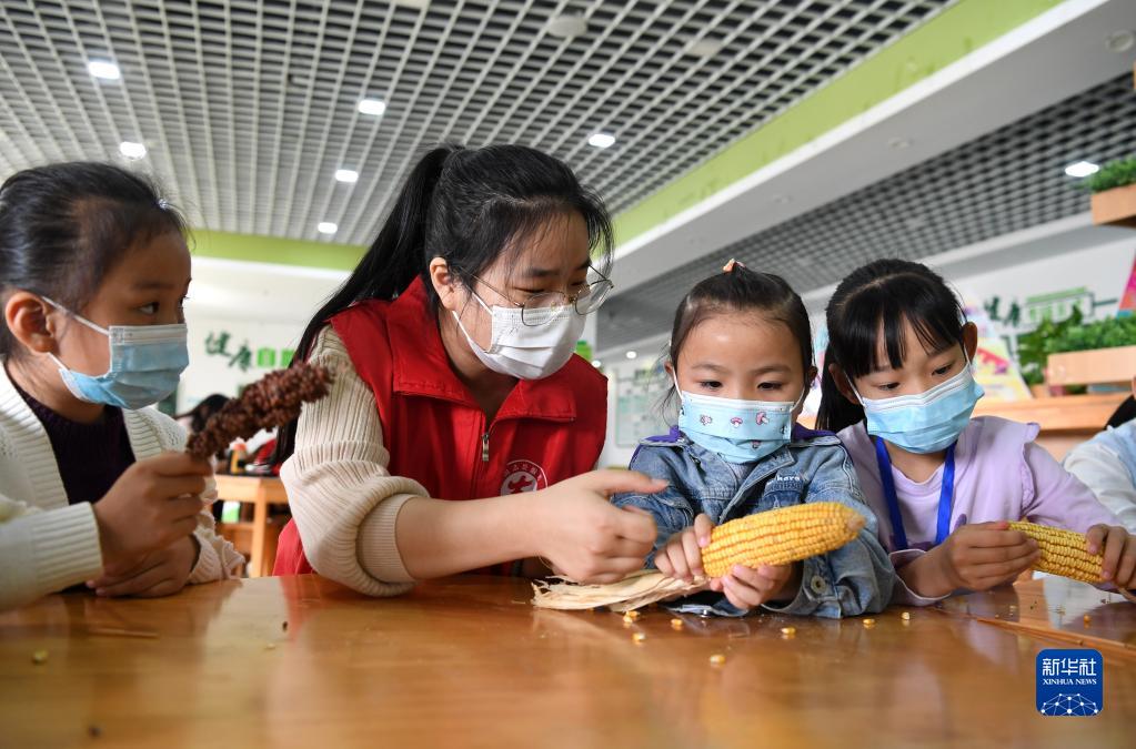 10月15日,安徽省合肥市包河區常青街道油坊崗社區志愿者向轄區小朋友介紹糧食作物。