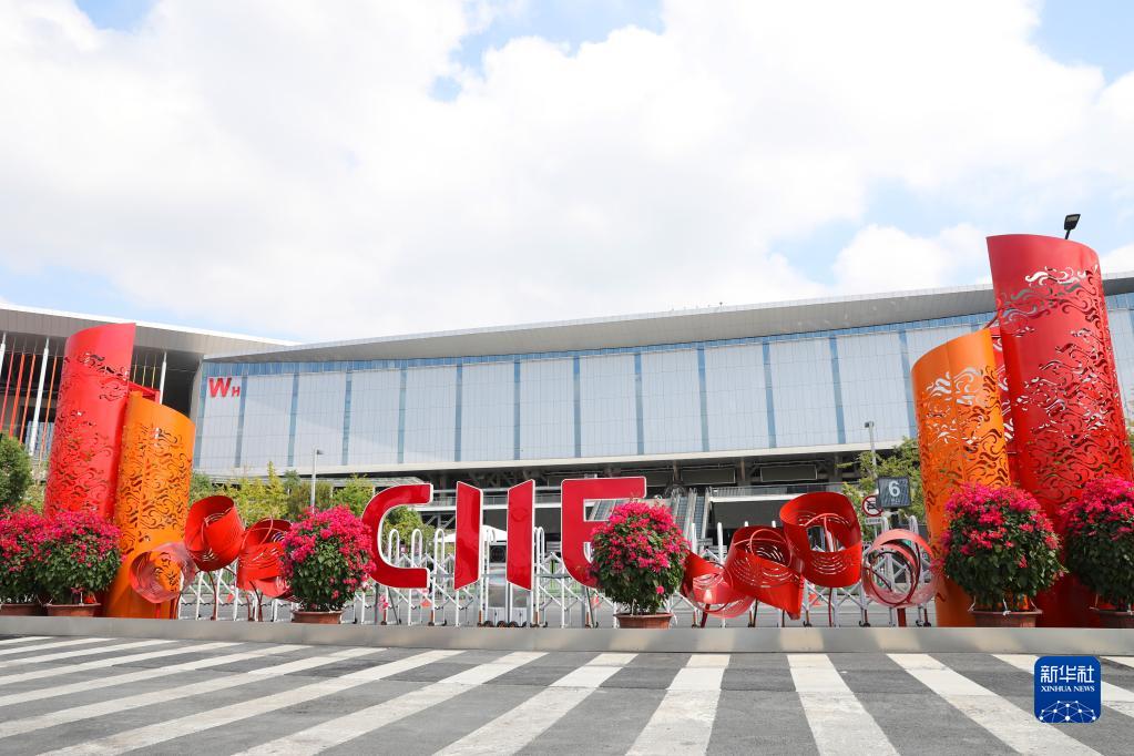 這是國家會(huì)展中心(上海)西入口外的進(jìn)博會(huì)主題鮮花裝飾(10月15日攝)。