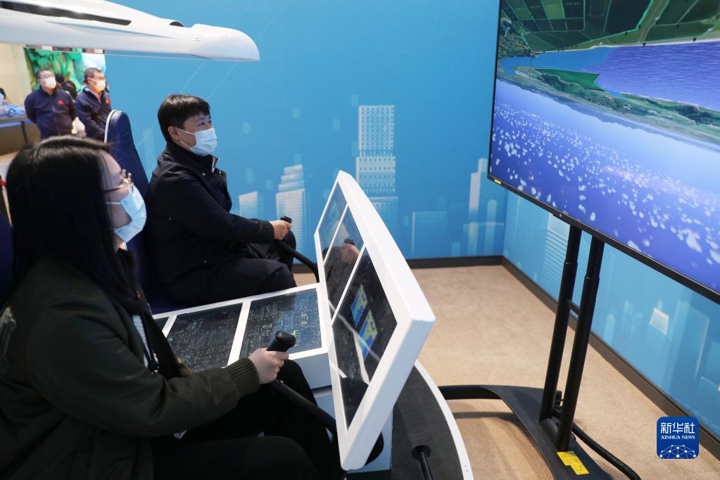 觀眾在“奮進新時代”主題成就展第八單元“堅持走中國特色強軍之路 全面推進國防和軍隊現代化”展廳體驗直升機綜合程序訓練器互動體驗裝置(10月12日攝)。新華社記者 許雅楠 攝