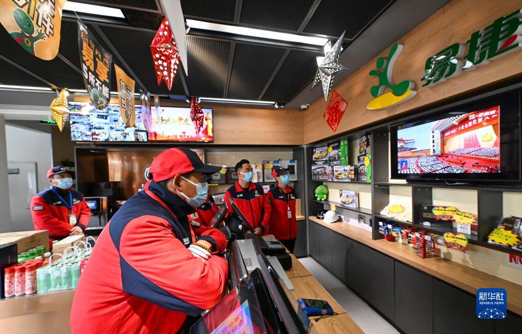10月16日,在位于天津市南開(kāi)區(qū)的中國(guó)石化銷售股份有限公司天津石油分公司長(zhǎng)江道加油站,工作人員在工作間隙觀看開(kāi)幕會(huì)直播。