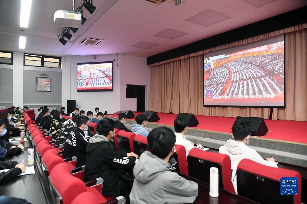 10月16日,在北京交通大學(xué)中心報告廳,學(xué)生收看中國共產(chǎn)黨第二十次全國代表大會開幕會。