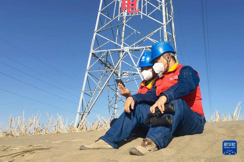 10月16日,在塔克拉瑪干沙漠中,新疆和田供電公司保電人員在巡視110千伏輸電線路途中,通過手機收看中國共產(chǎn)黨第二十次全國代表大會開幕會。