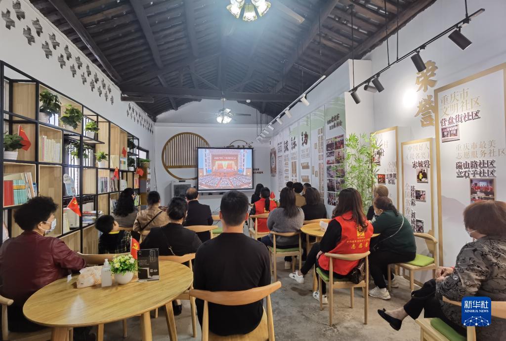 10月16日,在重慶市合川區合陽城街道新時代文明實踐點,居民收看中國共產黨第二十次全國代表大會開幕會。
