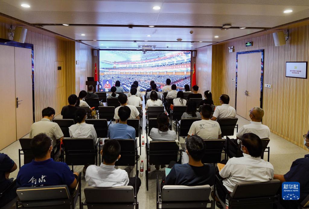 10月16日,在位于海南省三亞市崖州灣科技城的崖州灣種子實驗室,科研工作者收看中國共產黨第二十次全國代表大會開幕會。