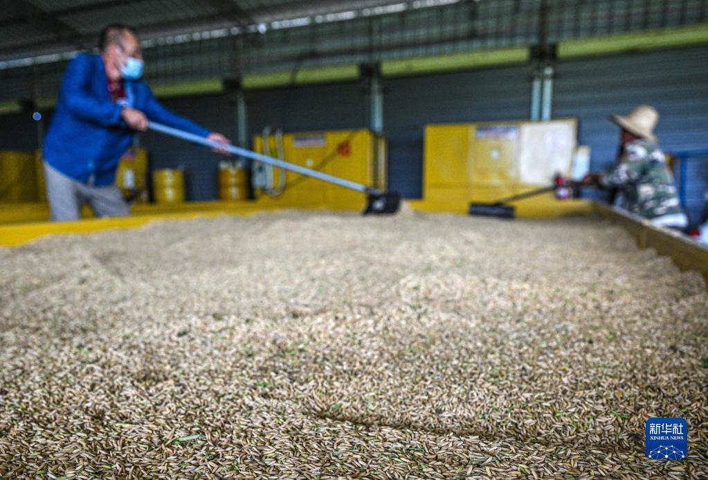 10月15日,工人在位于海南省東方市的海南湘谷源農(nóng)業(yè)有限公司烘干廠忙碌。新華社記者 蒲曉旭 攝