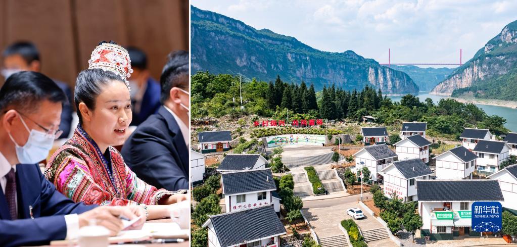 拼版照片:左圖為黨的二十大代表許蕾在貴州代表團討論中發言(新華社記者劉衛兵10月17日攝);右圖為貴州省黔西市新仁苗族鄉化屋村麻窩寨易地扶貧搬遷集中安置點(新華社記者陶亮5月6日攝)。