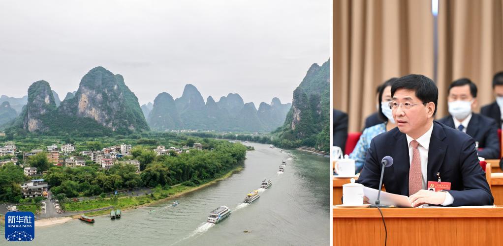 拼版照片:右圖為黨的二十大代表周家斌在廣西代表團討論中發(fā)言(新華社記者謝環(huán)馳2022年10月17日攝);左圖為漓江廣西陽朔段(新華社記者曹祎銘2021年4月25日攝)。