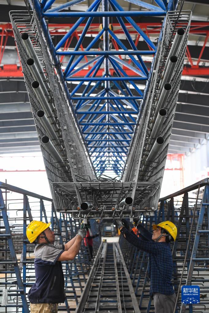 10月18日,工人在黃茅海跨海通道智慧梁場綁扎預制箱梁鋼筋籠。
