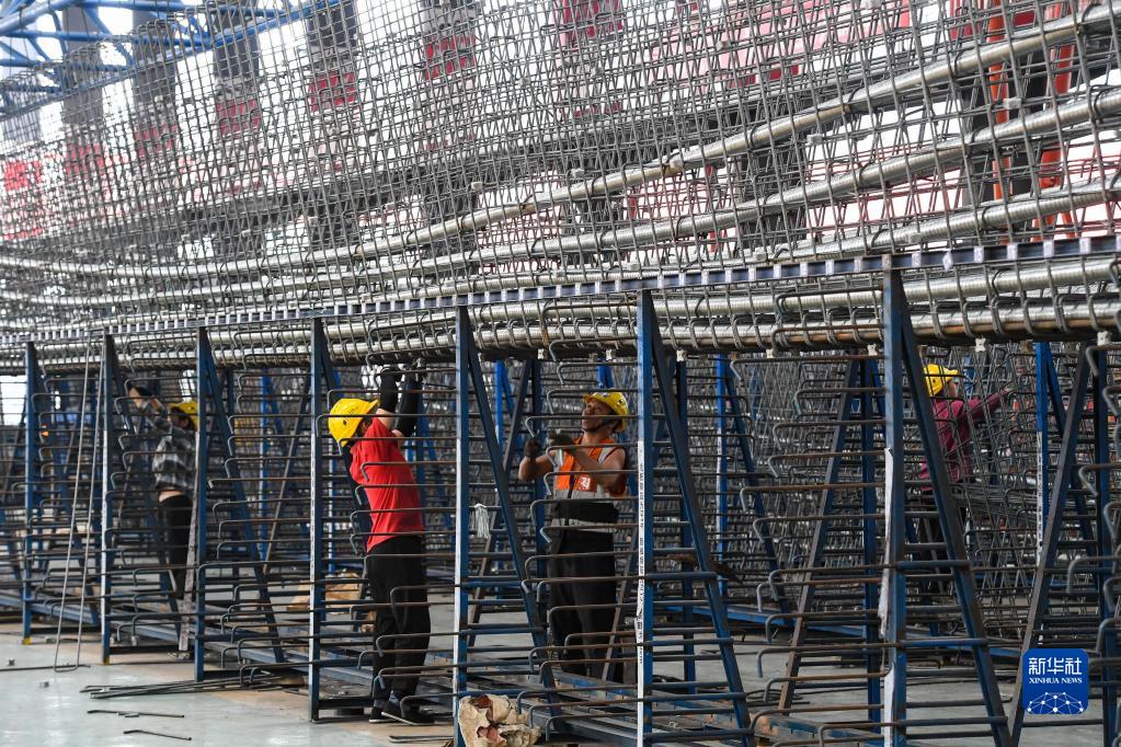 10月18日,工人在黃茅海跨海通道智慧梁場綁扎預(yù)制箱梁鋼筋籠。