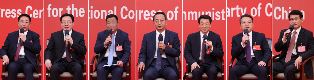 10月19日,中國共產(chǎn)黨第二十次全國代表大會新聞中心舉行集體采訪。山東、河南、湖北、湖南、廣東、廣西、海南代表團(tuán)新聞發(fā)言人出席,介紹代表團(tuán)學(xué)習(xí)討論二十大報(bào)告情況,并回答記者提問(拼版照片)。
