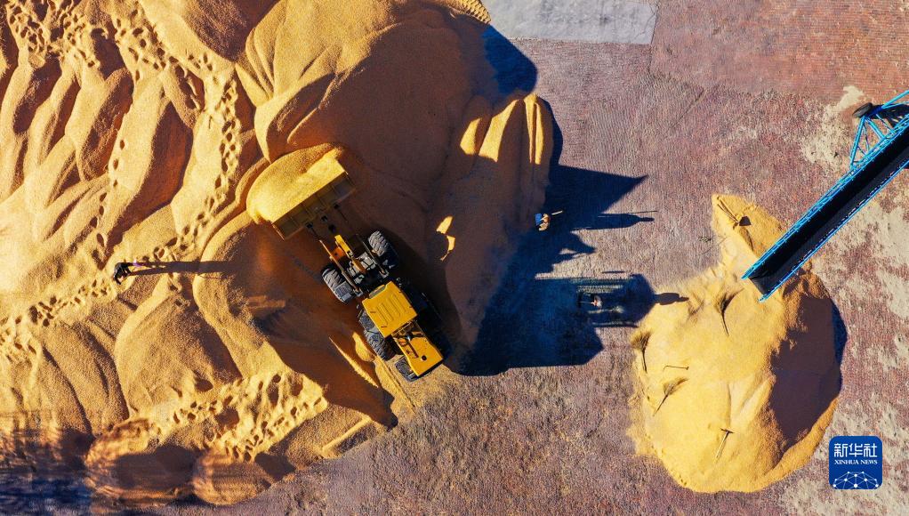 10月18日,在通遼市奈曼旗新鎮舍布日圖嘎查,工人在收糧站晾曬玉米(無人機照片)。