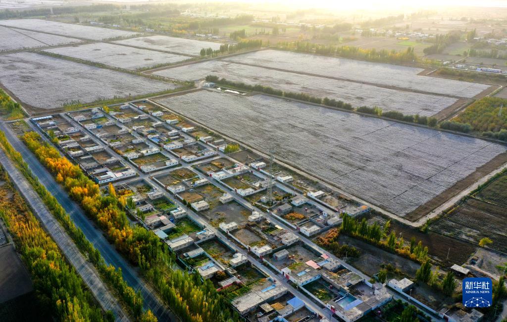 俯瞰新疆沙雅縣紅旗鎮一處棉田(10月18日攝,無人機照片)。