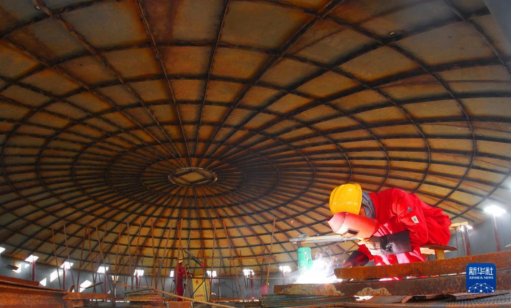 在中石化天津南港乙烯項目建設現場,施工人員在進行污水罐焊接作業(9月23日攝)。