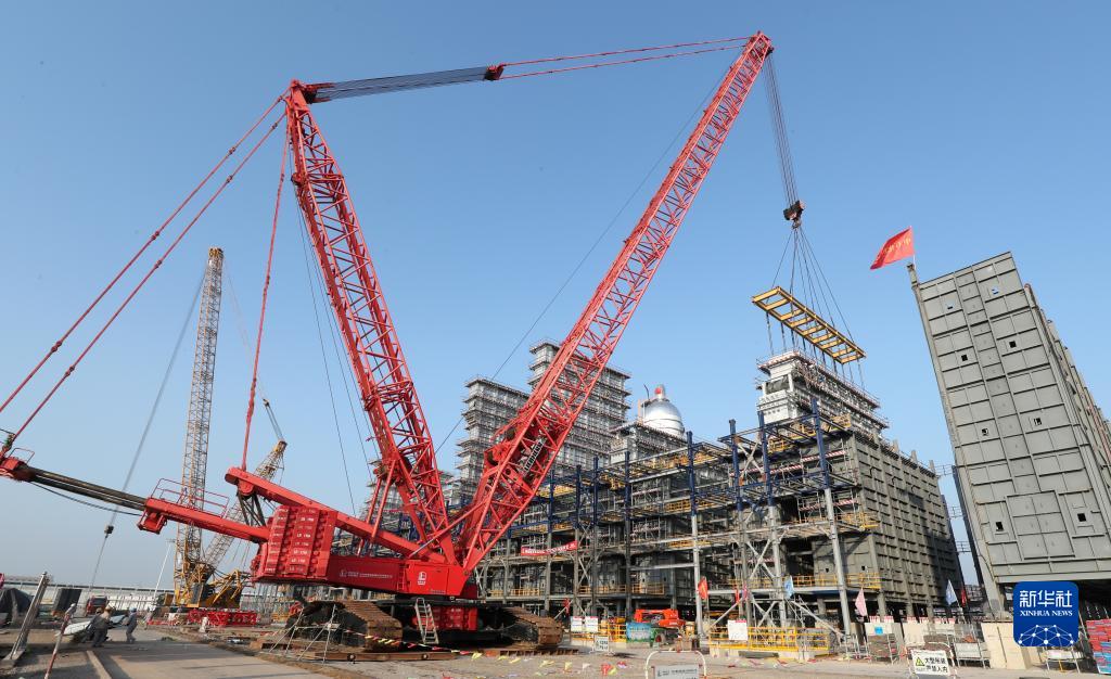 在中石化天津南港乙烯項目建設現場,施工人員在安裝裂解爐模塊(10月7日攝)。