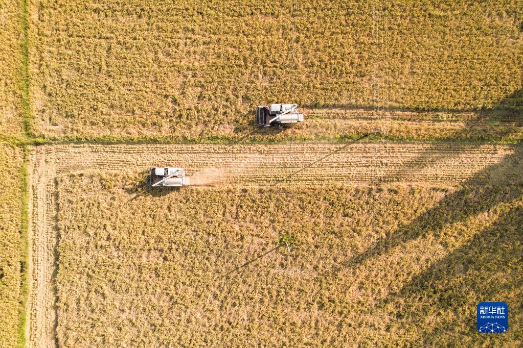10月19日,在湖南省常德市安鄉縣三岔河鎮,農民駕駛農機收割晚稻(無人機照片)。