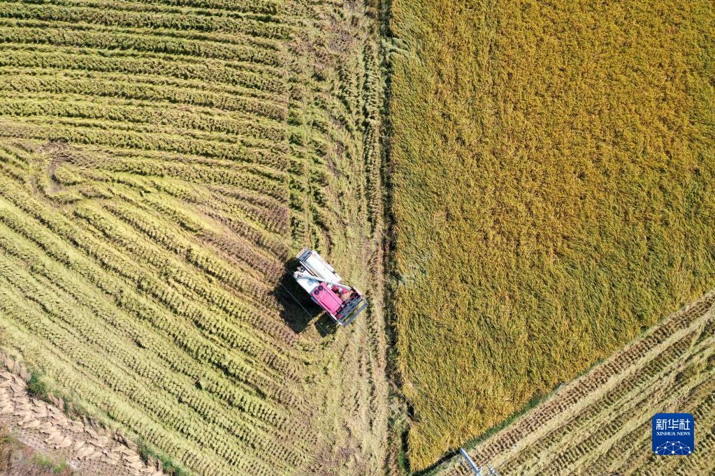 10月20日,在江西省南昌市南昌縣廣福鎮漳溪村,種植戶在收割晚稻(無人機拍攝)。