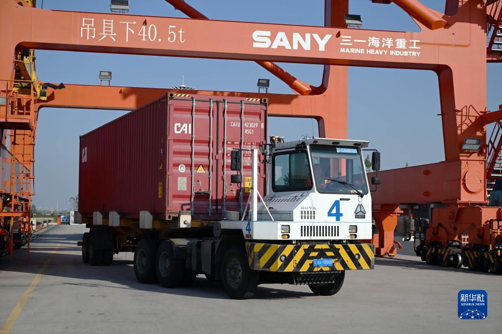 10月19日,貨車在合肥港國際集裝箱碼頭運輸集裝箱。