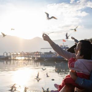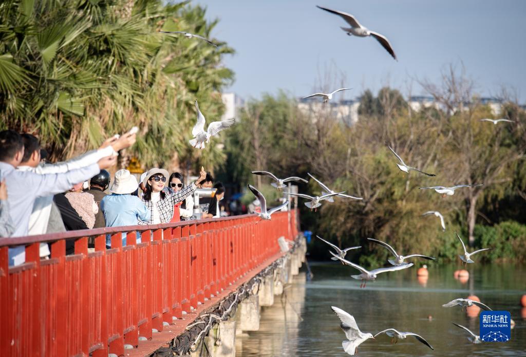 10月20日,市民在滇池畔投喂紅嘴鷗。