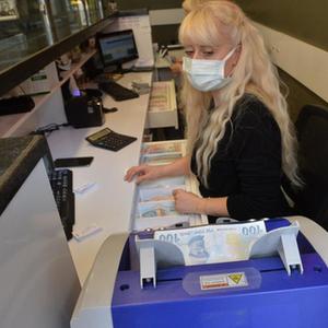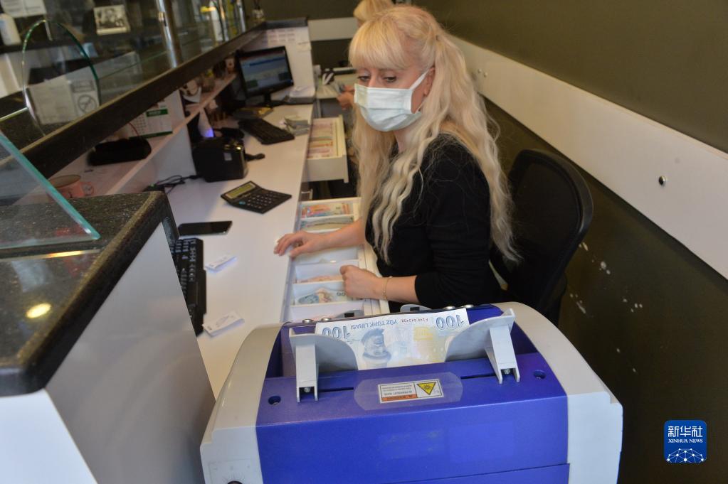 10月20日,工作人員在土耳其安卡拉的一處貨幣兌換點清點紙幣。