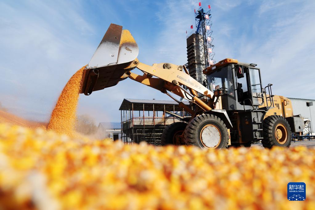 10月20日,在北大荒農墾集團有限公司北安分公司趙光農場有限公司,鏟車在一處曬場傾倒玉米。