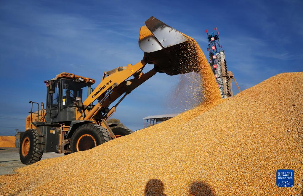 10月20日,在北大荒農墾集團有限公司北安分公司趙光農場有限公司,鏟車在一處曬場傾倒玉米。