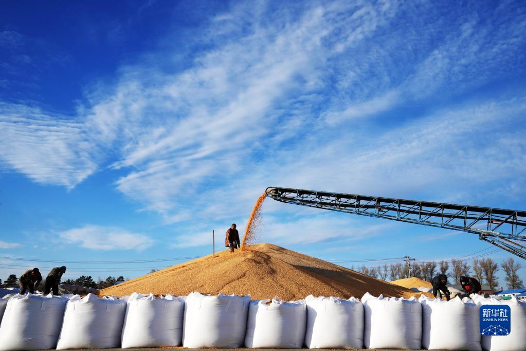 10月19日,在北大荒農墾集團有限公司北安分公司趙光農場有限公司,工作人員在一處曬場的玉米堆上忙碌。