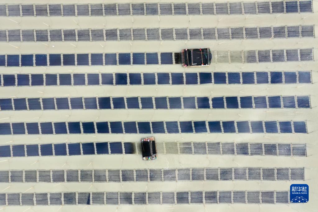 金秋十月,福建省寧德市霞浦縣6.5萬畝海上養殖紫菜迎來收獲時節,漁民們操作收割船在大海中采收頭水紫菜,展開一幅海上秋收畫卷。霞浦縣素有“中國紫菜之鄉”美譽,形成紫菜育苗、種植、加工全產業鏈條,年產值近10億元。紫菜成為當地群眾增收致富的支柱產業。