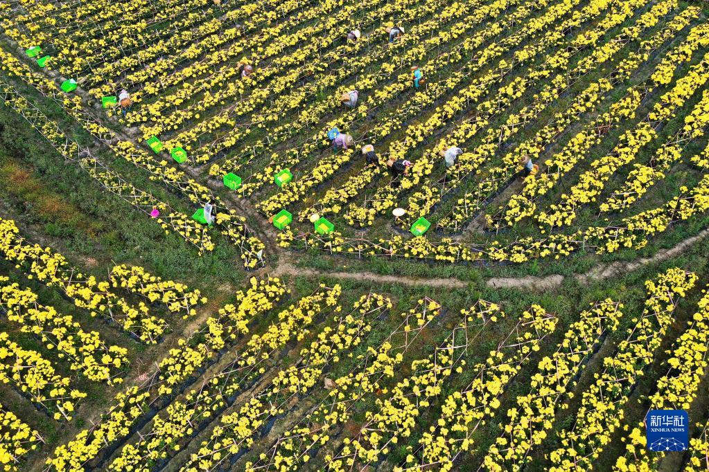 金秋時節,貴州省黔南布依族苗族自治州貴定縣云霧鎮種植的1000余畝菊花陸續進入采摘期,當地村民忙著采摘、分揀、烘干菊花,供應市場。