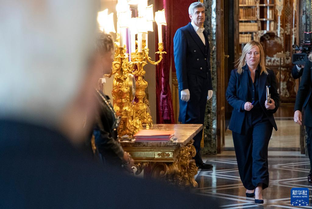 10月21日,意大利兄弟黨黨首焦爾吉婭·梅洛尼(右)抵達位于羅馬的意大利總統(tǒng)府。
