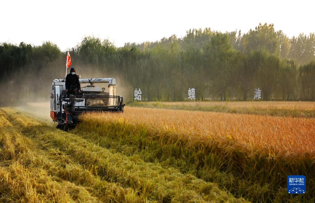 在西安市長安區(qū)王曲街道皇甫村,村民駕駛收割機收割水稻(10月21日攝)。