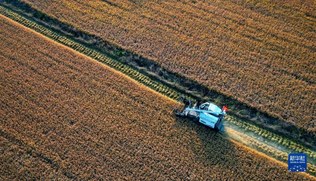 在西安市長安區王曲街道皇甫村,收割機在收割水稻(10月21日攝,無人機照片)。