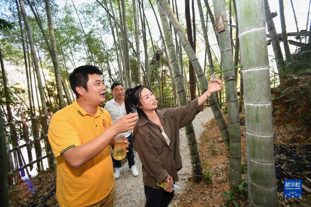 10月23日,在占西坑村竹酒生產(chǎn)基地,陳清(左)指導(dǎo)游客從竹節(jié)中取酒。