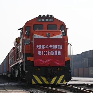 當日,隨著一列發往二連浩特的班列完成集裝箱吊裝,天津港今年海鐵聯運量突破100萬標準箱,比2021年提前64天。
