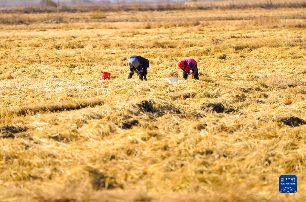 10月25日,在吉林省延邊朝鮮族自治州和龍市光東村,農(nóng)民在稻田間撿拾稻穗。