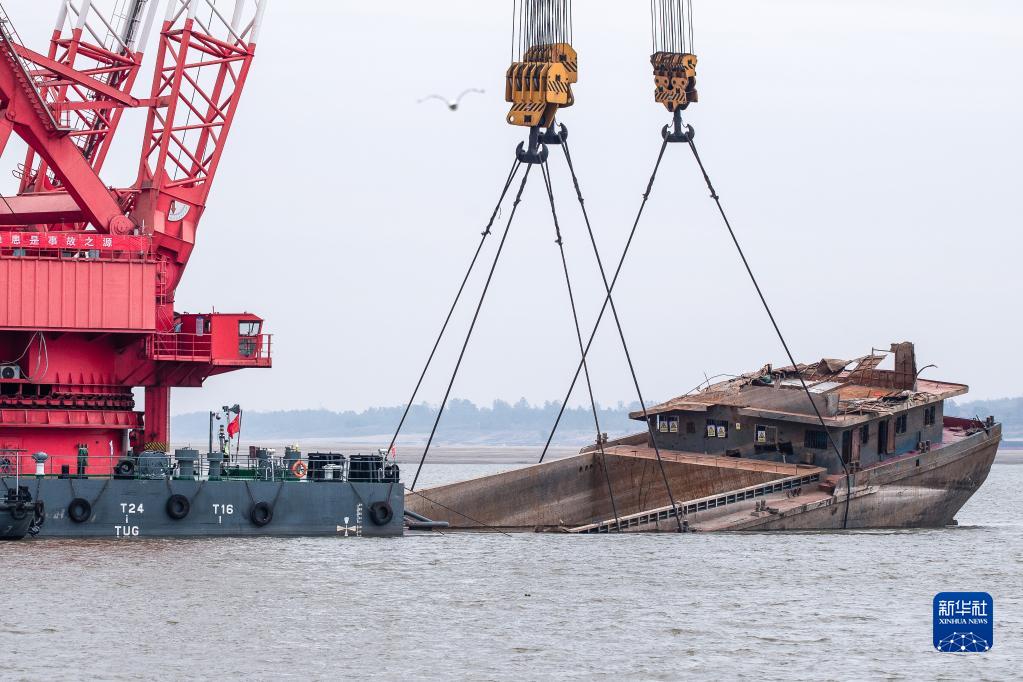 10月25日,礙航歷史沉船“二航9566”被吊出水面。 新華社記者 肖藝九 攝