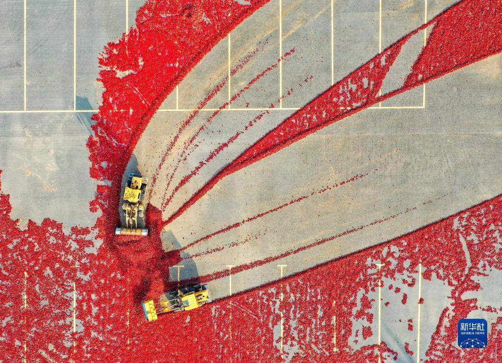 10月25日,在開魯縣東風(fēng)鎮(zhèn),工作人員駕駛鏟車收獲晾曬好的紅干椒(無人機照片)。