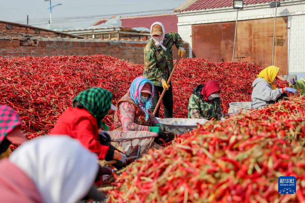 10月25日,在開魯縣東風鎮東方紅村,工作人員分揀處理紅干椒。
