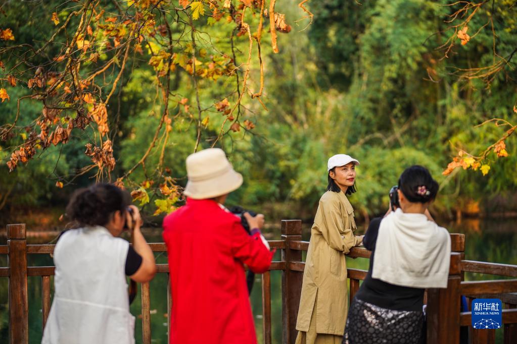 10月25日,市民在貴陽市花溪國家城市濕地公園黃金大道拍照留念。