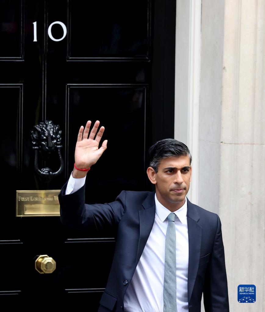 10月25日,新就任的英國首相里希·蘇納克發表講話后在倫敦唐寧街10號首相府前揮手致意。