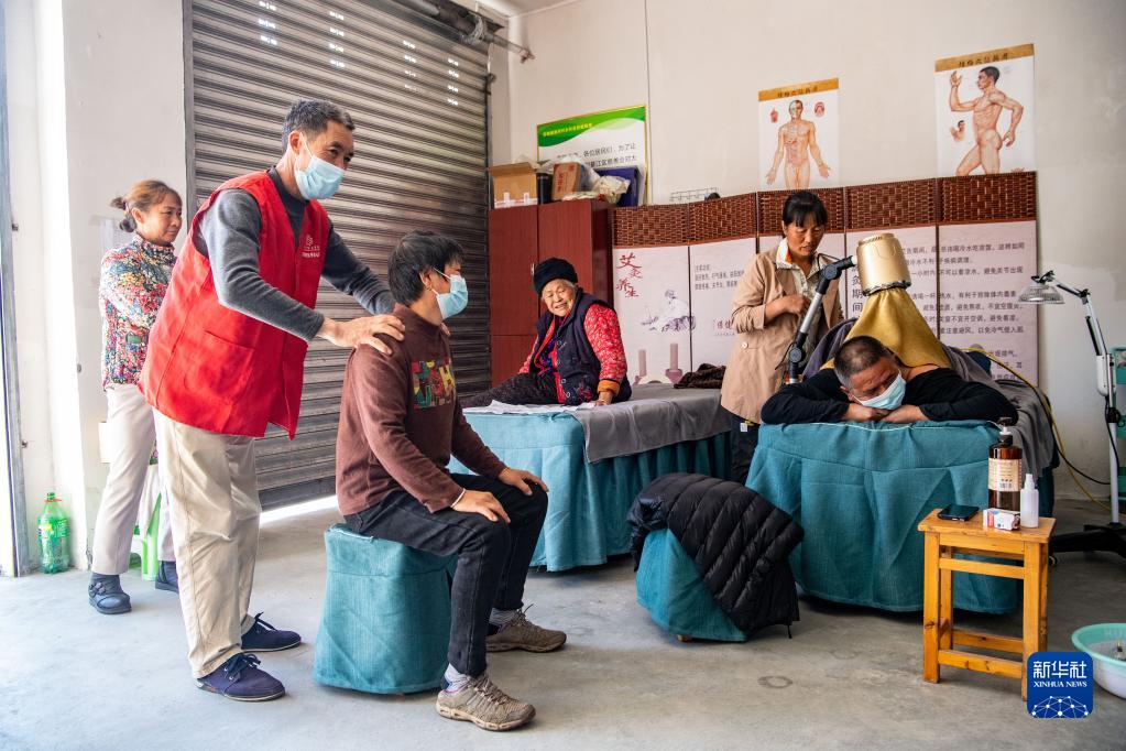 在重慶市綦江區安穩鎮崇河村“自然健康屋”,志愿者為老人提供免費理療服務(10月18日攝)。“自然健康屋”是當地民政部門建立的普惠養老場所。