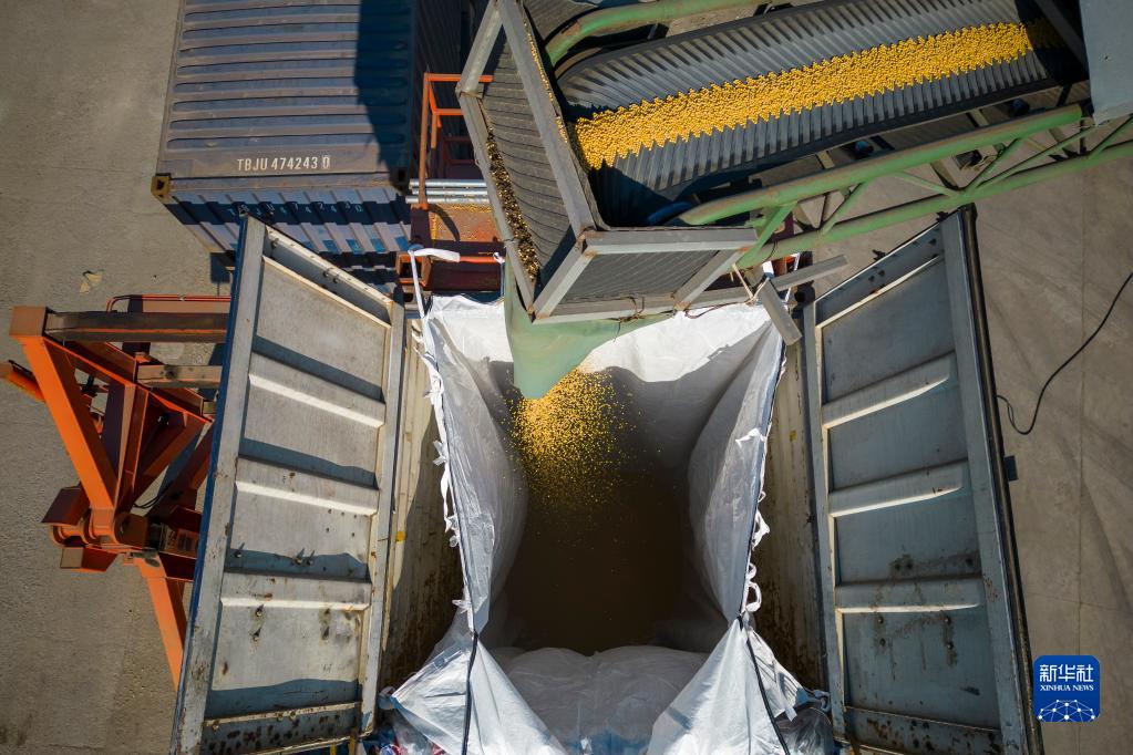 10月25日,在綏化市益盛糧食購銷有限公司內,工人利用機器將大豆裝入鐵路貨運集裝箱(無人機照片)。