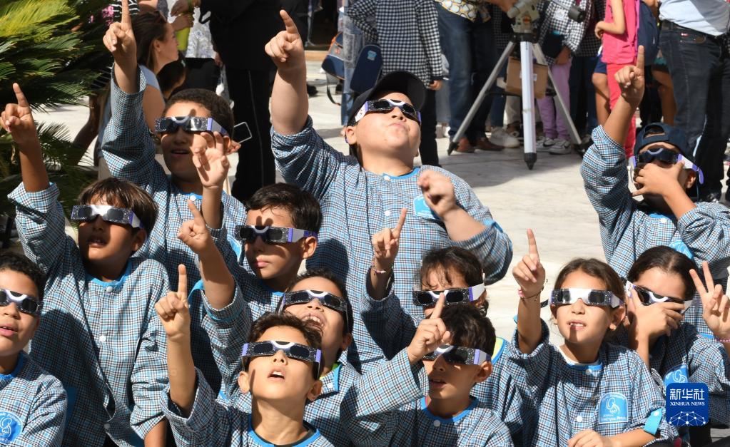 10月25日,突尼斯小學(xué)生戴著特制墨鏡在突尼斯市觀看日偏食。